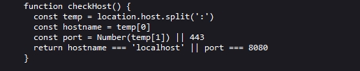 This function takes the location.host variable and checks if the hostname part is localhost or the port part is 8080 and return true if either is a match. Now let’s bypass checkhost. Let’s take a look again at the checkHost function. So, we need to verify the hostname and port, the location.host variable is split by the port-separator, :. But since the location.host variable won’t have any port-separator on the challenge page, we will only get the hostname in the temp array.
