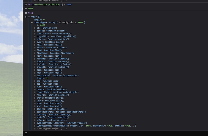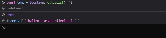 We have successfully polluted the Array prototype. Now we need to find way to use this to bypass checkhost. So const temp = location.host.split(':') will result in an array with only one element and the const port = Number(temp[1]) || 443 will try to get the non existent second element of the array, we can try to set the property 1 on the Array prototype to the value 8080. To verify that this should work we can try this out in the console.