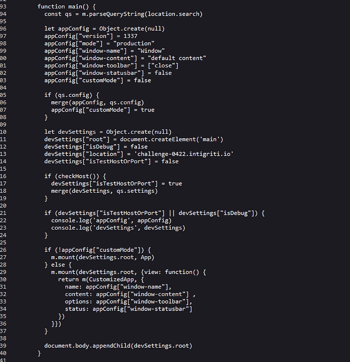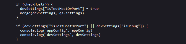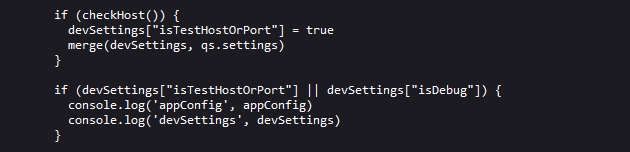 After the query string is parsed, a dictionary object named appConfig is created an initialized with some default values. Then a check to see if the config prop exists on the parsed query string object, if it exists a call to the function merge is made with the appConfig and the supplied query string object. Then another dictionary object is created named devSettings, which contains a main element and some other settings. Then a call to checkHost is made and if it returns true a call to the merge function with the devSettings and the settings object from the query string is made.After this there’s a check to see if isTestHostOrPort or isDebug on the devSettings object is true, if one of them are true the appConfig and devSettings objects are printed to the JavaScript konsole. If the customMode on the appConfig is false, the default App component is rendered using the main element from devSettings. Let’s take a look at the merge function.