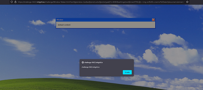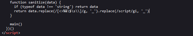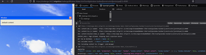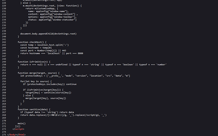 So, we are able to modify both the appConfig and devSettings object. Let’s try to modify the innerHTML property with our payload. To set the values on devSettings the object qs.settings is used, which means that our query string parameter should look like this settings[root][innerHTML]. So let’s try it out with the payload <img src=x onerror=alert(document.domain) /> and see what happens.Using the query string ?config[window-toolbar][constructor][prototype][1]=8080&settings[root][innerHTML]=<img%20src%3Dx%20onerror%3Dalert(document.domain)%20%2F> nothing happens lol. But if we set a breakpoint right after the merge(devSettings, qs.settings) call and taking a look at the innerHTML property we will see _img_src=x_onerror=alert(document.domain)_/_. Now we have left to do is to bypass the sanitize function.