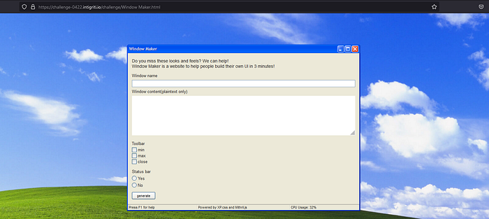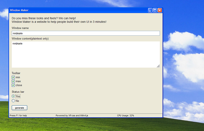 So we got a Windows XP style UI generator. Nostalgia hits. So let’s enter some values and see what happens.
