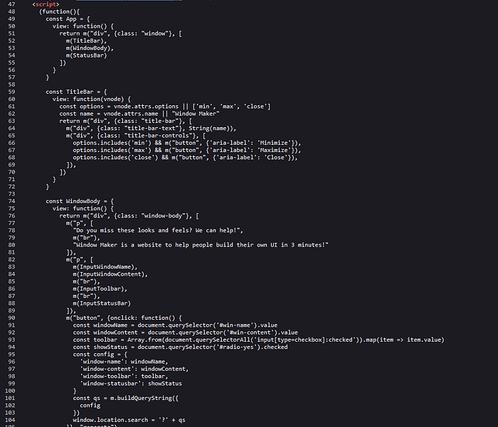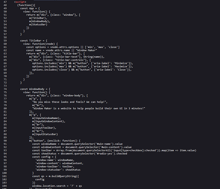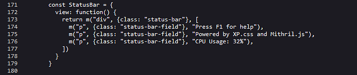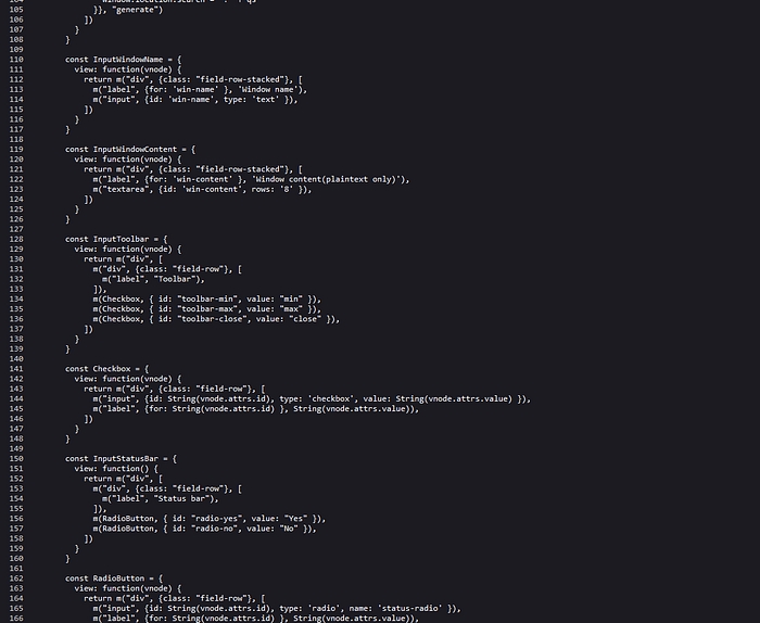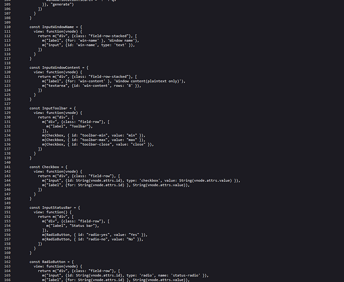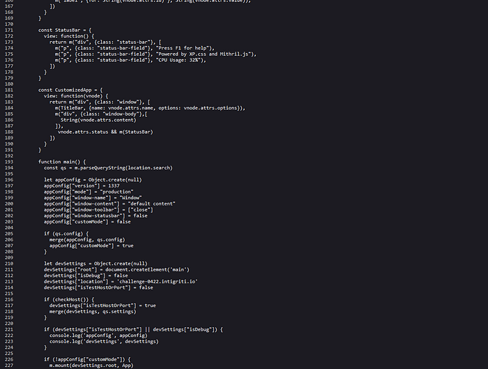 We can see the usage of the function m, and let’s take a look at the documentation and this is the way to create DOM elements using Mithril. If we check all components we will see that all DOM elements are created using constants. So we are not able to inject any elements. After the components we have the function main.