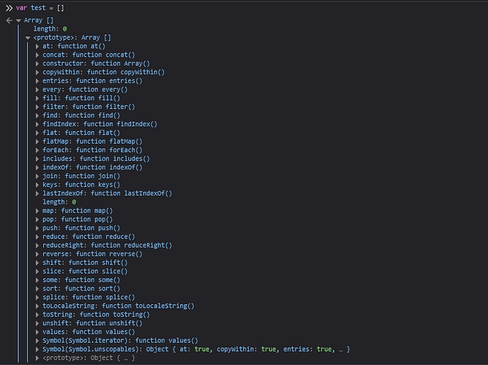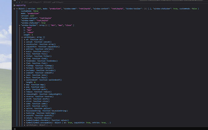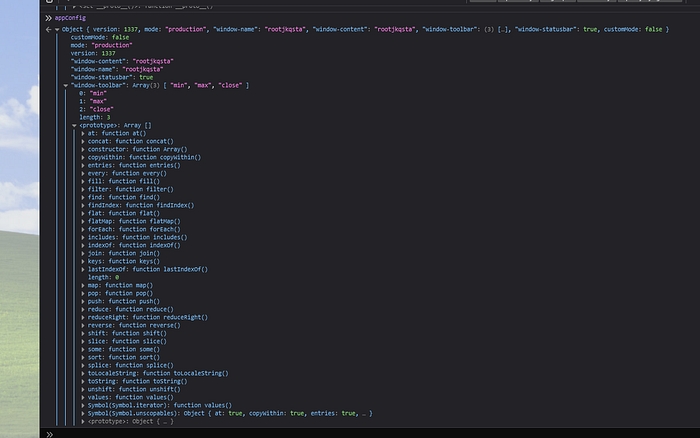 This is bc the creation of the appConfig object is done by Object.create(null) which will create a constructor-less object. So we have to find another way to abuse this. If we take a look at the appConfig object again we can see that the window-toolbar property is an array. Let’s see if we can pollute the array prototype instead. If we send the following query string ?config[window-toolbar][constructor][prototype][test]=test to set the test property on the Array prototype. We have the property test in the Array prototype. And when we verify that the prototype pollution works we get the following.
