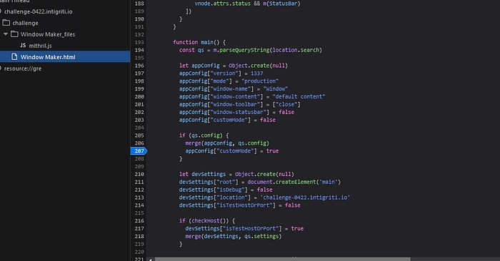 We know that this function will assign each value from the parsed query string to the target object, which in this case is appConfig. This means that we should be able to assign our own keys and values to the appConfig object. To verify this we can enter the following query string, ?config[test]=test, set a breakpoint after the merge call using the debugger and finally checking the values of the appConfig object. So let’s set the breakpoint.