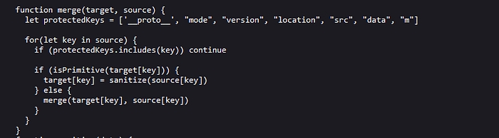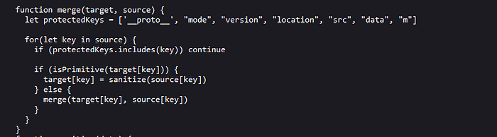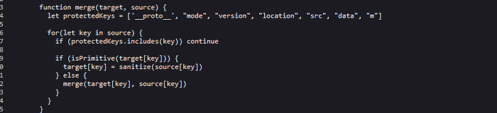 It will check if the type of the value is a primitive type and if it is a primitive type. The result of the call to sanitize using the new value is assigned to the target object. If the current key is a complex type, a recursive call to the merge function is made to make a deep copy of the data structure. Let’s take a look at the sanitize function.