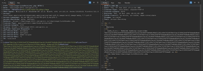 Token is likely set to a 64-character string, FirstText and Hashing are set based on our input. Remember how entering a non-valid hashing algorithm revealed some verbose warning messages by PHP?