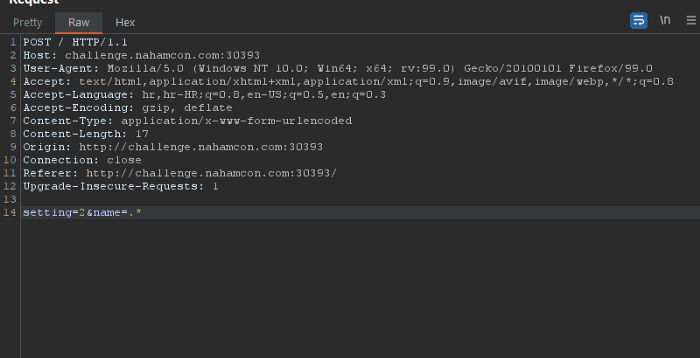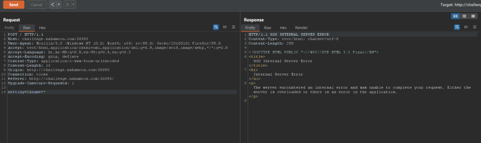 Response is 500 Internal server error. The pattern was [A-Z][a-z]*?*[a-z]*? . Given that the injected * is placed after ? mark, it’s normal to get the error we got in the response. But if we can inject into a regex, then we have the chance of telling the findall() method to return all the results at once including the flag. Using .*
