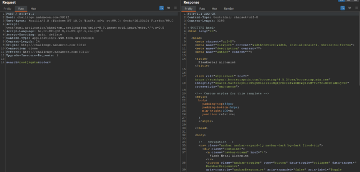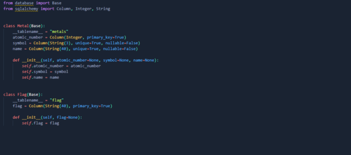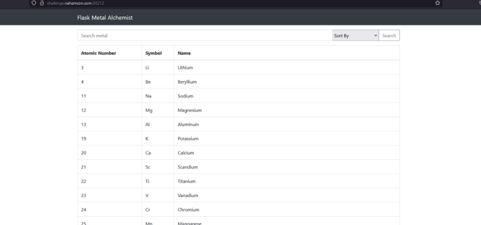 Response is 200 OK. If we now try to set order to the true payload like CASE WHEN 1=1 THEN atomic_number ELSE name END, we can see that the first element returned is Lithium. When we then invert the condition to something false like 1=2 we get Actinium, meaning our condition is actually evaluated by the server. Now we can use this condition to get the flag. We could try and parse the whole HTML response to look at what metals were returned. But since the response is always the same for a true condition, and always the same for a false condition, we can just save a hash like md5 of both responses and compare them when we get a response. Then we know what hash corresponds to what type of response, without having to deal with parsing HTML. I made a simple web() function to test if a certain condition is true or false. Then we can use this function to get the flag.
