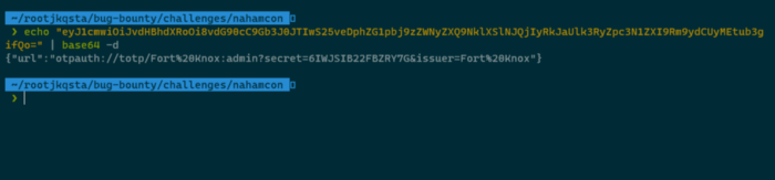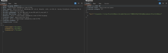 As you can see I had errors so I had to switch accounts like I said. So in response we have this otpauth, but this secret is our secret actually of our account. We need admin’s secret. You might start thinking like me for XSS, stealing cookies lol.