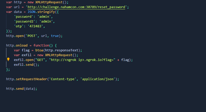 So this is our new code for new password. Basically we will be able to reset admin’s password. You can take a look at view page source and password,password2,otp will be our parameters also make sure we have in JSON format we have set as JSON stringify. So why did I put password and password2 as a admin? So this will automatically update admin’s password to admin password. And we need to set OTP quickly before new OTP re-generates. Don’t forget to update your ngrok address and port! So remove 2fa.js and change it to the reset_password.js then submit it. And update OTP before sending feedback like I said once. So I had errors again for no reason. So since this is the last part let me explain this in the text. After you submit new feedback you will get something in your http.server. You should get a flag and it will be base64 encoded again. So you will need to decode it. And when you decode it, response should be success not fail. So this means that OTP is valid and we reset the password. Just logout and put admin as a username and admin as a password and put OTP and when you log to the admin’s account click on secret and enter OTP code again and that is it, you will get a flag. This challenge was interesting not gonna lie.