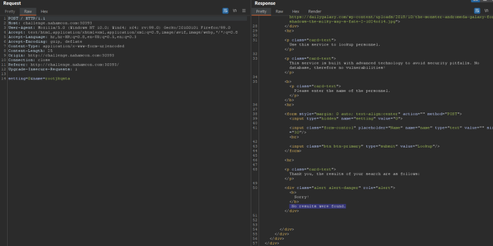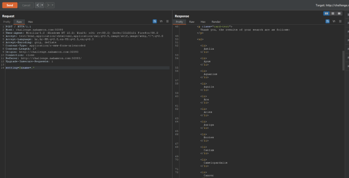 So I typed my name as a rootjkqsta and sent request. Response was 200 OK but if you scroll down, you will se Sorry! No results were found. So what does this means? It means that it’s using re.findall() method to search for matches in the name we submit in our request. Notice that the name parameter’s value is embedded into the pattern the regex uses to filter out the results. Let’s inject * and see what response are we gonna get.
