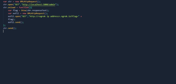 So we will be using same payload script src= bc server will load this JavaScript and then it’s gonna start executing. But what is it gonna execute? It is gonna creat new XMLHttpRequest and It’s gonna request to the localhost to the admin page and once this page is onload we will get response text and then base64 encode and it will create new HttpRequest and make request to our ngrok server with the result of the previous response and finally send it. And this last line it will send this request to the top xhr.open, it’s gonna wait for onload, once the page is loaded it’s gonna send another HttpRequest to our local server and with flag obviously. So let’s submit it.