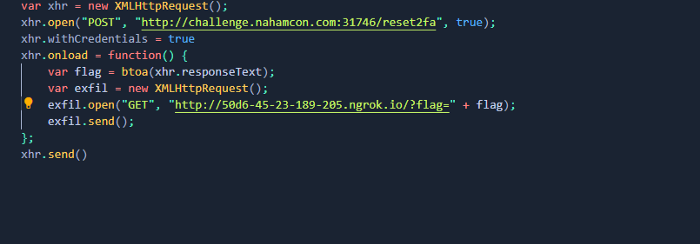This will be our JavaScript code. So here in this code we have a XMLHttpRequest which is set up here and we will make a POST request to the 2FA we intercepted that in our burp suite, just scroll up. We got a credentials set as a true. And we are gonna exfil train the response so we will get a response in base64 decode, we will create a new request and we will send back to the our ngrok server. Btw don’t forget to update your URL in this code. And update your ngrok address as well. So basically in feedback remove that exploit.js and add 2fa_exfil.js and then submit it.