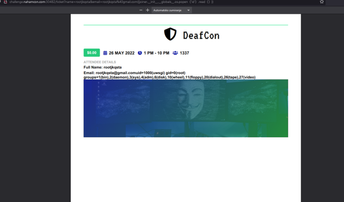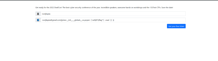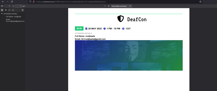 Alright so I entered my name and my email. And it lead us to the PDF file. And It’s something about ticket. In PDF it is possible to inject server-side XSS and escalate it to the SSRF. I tried injecting XSS but it didn’t worked nor can you escalate it to the SSRF. But however many people thought it was about email bypasses when they tried to inject XSS. No It’s not, you will always get 400 response code. Many of them tried CLRF Injection and etc. So I was in that position too. But let’s think PDF generator and email parser might be vulnerable to SSTI.