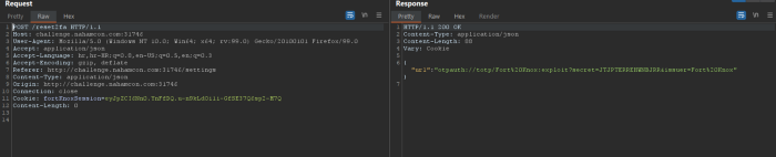 Alright I sent request and this is what we got as a response. So It didn’t took any parameters, we have our cookie but our response is otpauth again, so this is the URL we’ll be stealing from the admin using that blind XSS vulnerability we discovered in the feedback submission form.